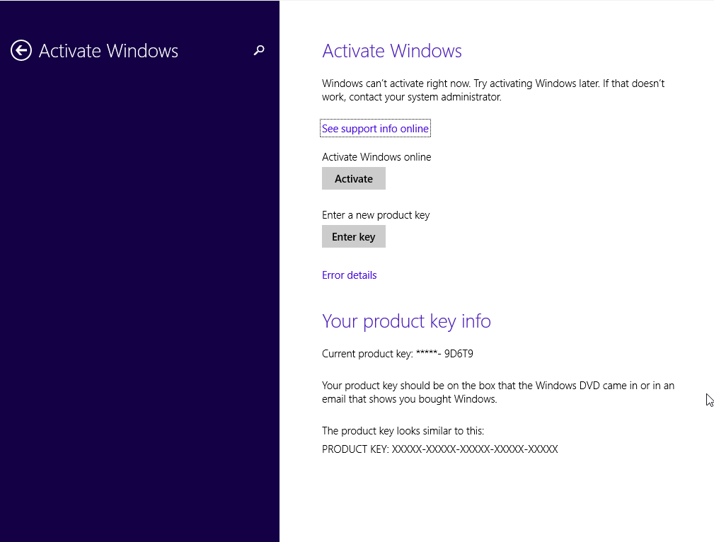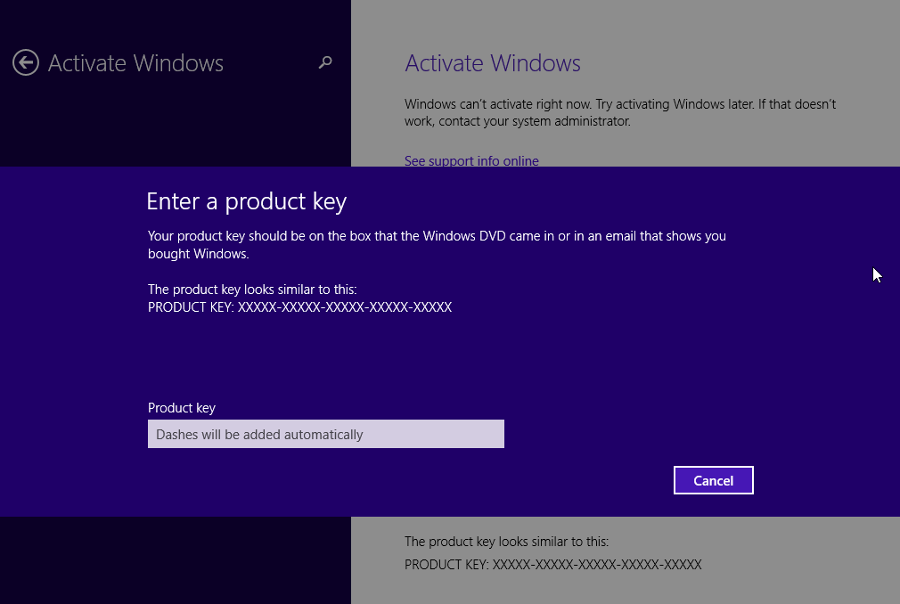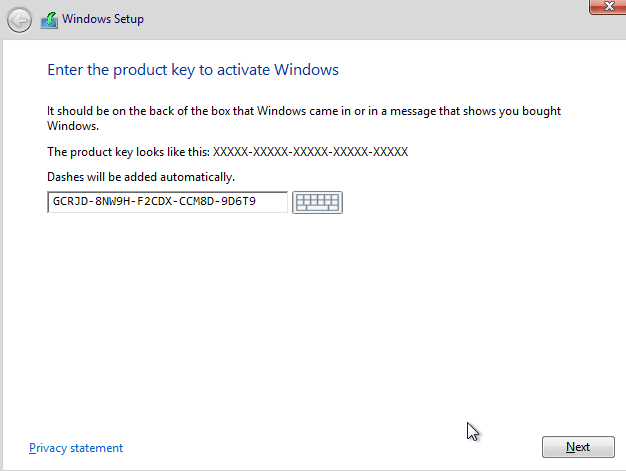 If the key is not accepted during installation, enter the generic Microsoft key: GCRJD-8NW9H-F2CDX-CCM8D-9D6T9. This is a key for installation only. When you’re done, enter the new password.