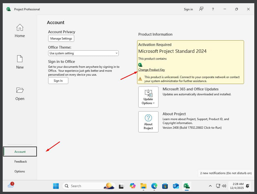 - Zodra uw applicatie is geopend, gaat u naar Account in de linkerbenedenhoek. Klik vervolgens op Wijzig productsleutel rechts onder de Office-pictogrammen.